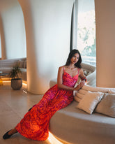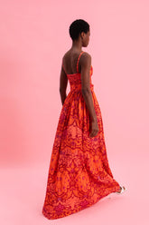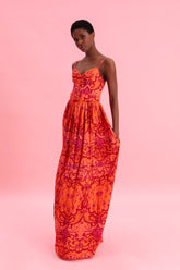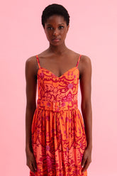 Εντυπωσιακό μάξι φόρεμα κατασκευασμένο απο 100% βαμβακερή βισκόζη, με αυξομειώμενες τιράντες. Αποτελεί την επιτομή του καλοκαιρινού στυλ με μια νότα πολυτέλειας.Αναδείξτε τη θηλυκότητά σας με αυτό το μάξι φόρεμα σε ζωηρό πορτοκαλί και φούξια baroque μοτίβο. Με κομψή εφαρμογή στο μπούστο και ντυμμένη ζώνη στη μέση για να τονίζει τη σιλουέτα, καταλήγει σε εντυπωσιακή, αέρινη φούστα που χαρίζει κίνηση και χάρη. Οι λεπτές ρυθμιζόμενες τιράντες προσφέρουν επιπλέον άνεση και εφαρμογή, ενώ το πίσω μέρος με σφηκοφωλιά εξασφαλίζει ευκολία στο ντύσιμο.Διαθέτει πλαινές πρακτικές τσέπες.Ιδανικό για καλοκαιρινές εξόδους, γάμους, ή ακόμα και νησιώτικους προορισμούς. Συνδυάστε το με ψηλά πέδιλα ή φλατ σανδάλια για πιο χαλαρό look.