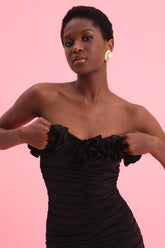Αυτό το εντυπωσιακό μαύρο μίνι στράπλες φόρεμα είναι σχεδιασμένο για να κλέβει τις εντυπώσεις. Κατασκευασμένο από εξαιρετικά ελαστικό ύφασμα που αγκαλιάζει το σώμα, προσφέρει απόλυτη εφαρμογή και άνεση. Οι σούρες σε όλη την επιφάνεια δημιουργούν ένα κολακευτικό εφέ, αναδεικνύοντας τη σιλουέτα, ενώ το μπούστο διακοσμείται με εντυπωσιακά χειροποίητα λουλούδια που προσθέτουν ρομαντισμό και όγκο στο επάνω μέρος. Ιδανικό για βραδινές εξόδους ή ιδιαίτερες περιστάσεις όπου το στιλ συναντά την αυτοπεποίθηση.