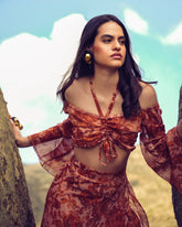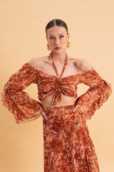 Αυτή η φούστα είναι μια εντυπωσιακή μάξι δημιουργία με ρομαντική και αέρινη διάθεση. Είναι κατασκευασμένη από ανάλαφρο ύφασμα με χρυσοκλωστή και floral μοτίβο σε αποχρώσεις του τερακότα, του κεραμιδί και του πορτοκαλί, δημιουργώντας ένα ζεστό και φυσικό σύνολο.
