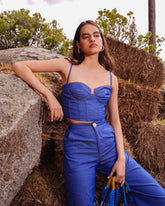 Στο πίσω μέρος, η ετικέτα με την κεντημένη υπογραφή "EVELEYA" προσδίδει ταυτότητα και πολυτέλεια στο κομμάτι, υπογραμμίζοντας τον σχεδιαστικό χαρακτήρα του brand. Το παντελόνι συνδυάζεται ιδανικά με το αντίστοιχο Cobalt Chic denim bustier για ένα total denim look που ξεχωρίζει ή με οποιοδήποτε πουκάμισο της συλλογής. Είναι ένα statement κομμάτι που συνδυάζει την άνεση με την urban αισθητική, ιδανικό για casual chic εμφανίσεις με χαρακτήρα.