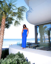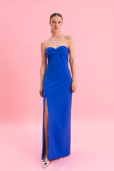 Αυτό το μάξι φόρεμα είναι μία εντυπωσιακή και σαγηνευτική πρόταση, ιδανική για βραδινές εμφανίσεις ή ιδιαίτερες περιστάσεις. Είναι στράπλες, με στητό μπούστο σε σχήμα καρδιάς που αναδεικνύει υπέροχα τους ώμους και το ντεκολτέ. Η γραμμή του είναι εφαρμοστή, αγκαλιάζει αρμονικά τη σιλουέτα και καταλήγει σε ίσια φούστα με σκίσιμο στο ένα πόδι, προσθέτοντας μία δόση θηλυκότητας και κίνησης.