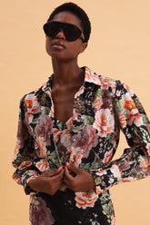 Αυτό το λινό πουκάμισο είναι η επιτομή της κομψότητας με μοντέρνα αισθητική και dark floral χαρακτήρα. Μια statement επιλογή για γυναίκες που αγαπούν τη θηλυκότητα με έντονη προσωπικότητα. Είναι κατασκευασμένο από ελαφρύ και δροσερό λινό ύφασμα, ιδανικό για τις ζεστές ημέρες. Το πουκάμισο ξεχωρίζει για το εντυπωσιακό φλοράλ print σε μαύρη βάση, με ρομαντικά ροζ, σομόν και μπεζ λουλούδια και πράσινες λεπτομέρειες φύλλων. Το dark background αναδεικνύει τα χρώματα και προσδίδει πολυτέλεια