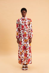 Κομψό midi φόρεμα από λινό ύφασμα με φλοράλ μοτίβο που αποπνέει διαχρονική θηλυκότητα και φινέτσα. Ο ζεστός συνδυασμός χρωμάτων σε αποχρώσεις του κόκκινου, πορτοκαλί και κίτρινου δημιουργεί μια ρομαντική και εντυπωσιακή αισθητική, ιδανική για κάθε περίσταση.